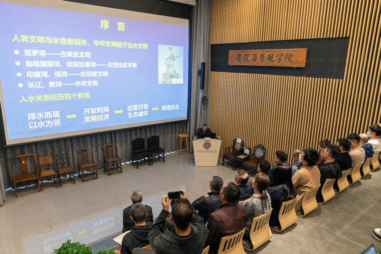 讲座中,陆桂华从水与人类文明的关系切入,详细介绍了中国古代的人水关系,经历了四个阶段:从择水而居到开发利用,再到过度开发导致生态破坏,最终到和谐共生的现代阶段,并指出“中国的文明起源于治水文明。”通过引用习近平总书记在2014年与2016年的重要讲话,也表达了当前国家层面对水资源问题的重视程度。
