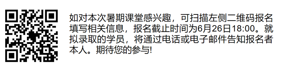 - 扫描问卷二维码,填写报名信息;- 点击文末“阅读原文”下载学员申请表,填写完整后发送至邮箱ual_sq2024@163.com,邮件主题请按照“姓名-单位-暑期学校申请”的格式填写;