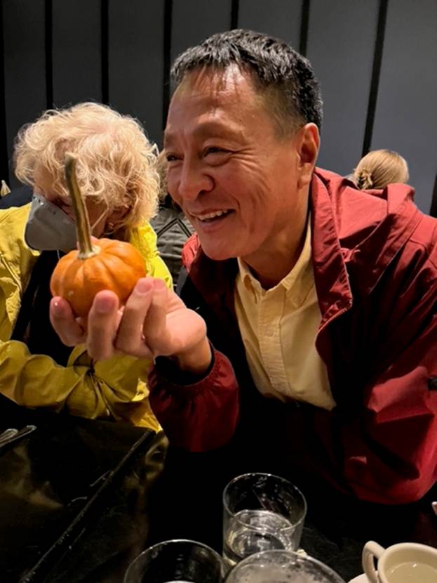 我找到了一张照片,是孔坚去年在波士顿港乘船游览一天后,在晚餐时拍的。