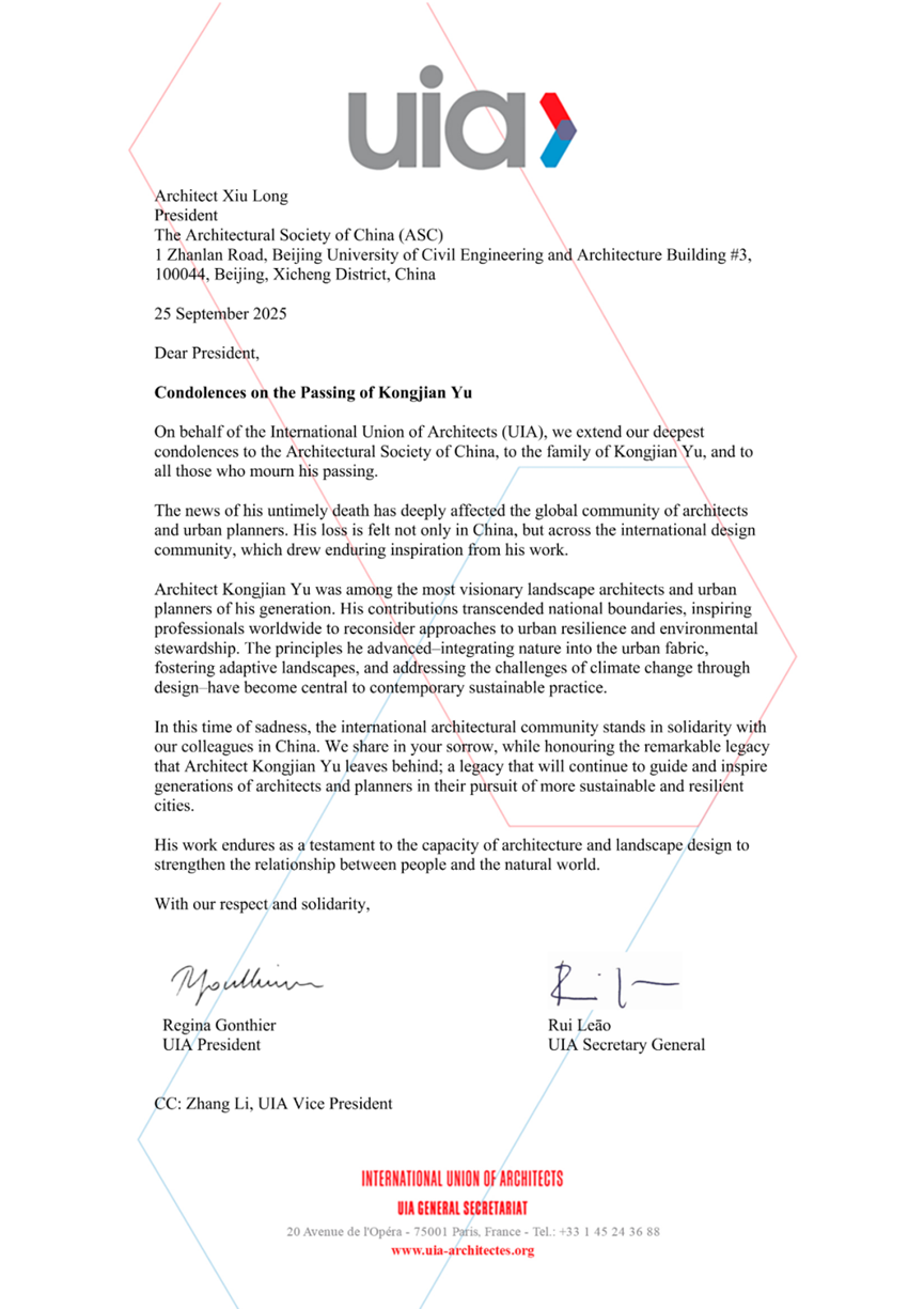 我们谨代表国际建筑师协会(UIA),向中国建筑学会、俞孔坚先生的家人以及所有悼念他的人们,致以最深切的哀悼。