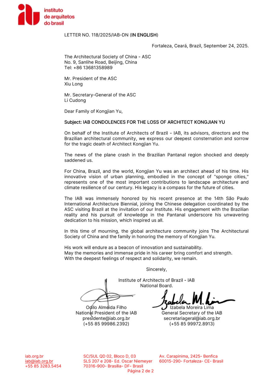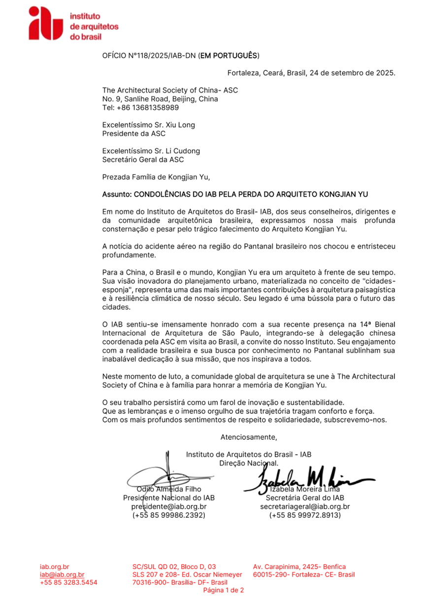 我们谨代表巴西建筑师协会(IAB)及其顾问、理事和巴西建筑界,就建筑师俞孔坚先生的悲剧性离世,致以最深切的哀悼与悲痛。