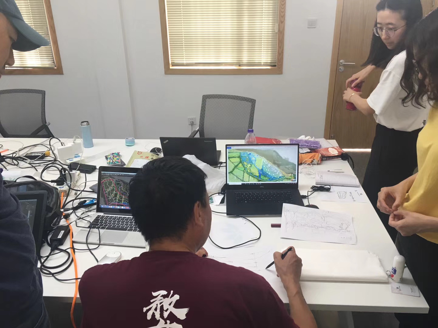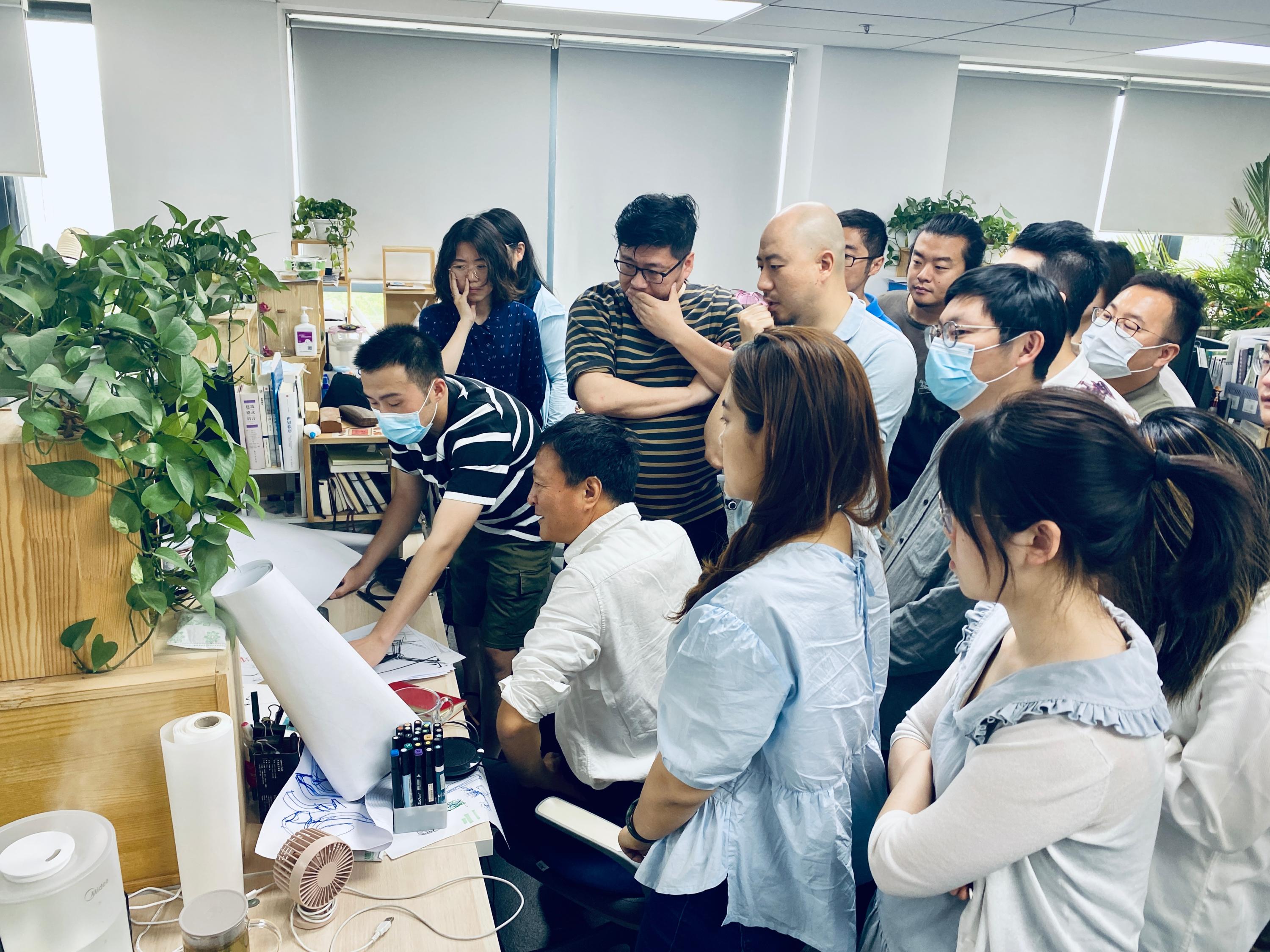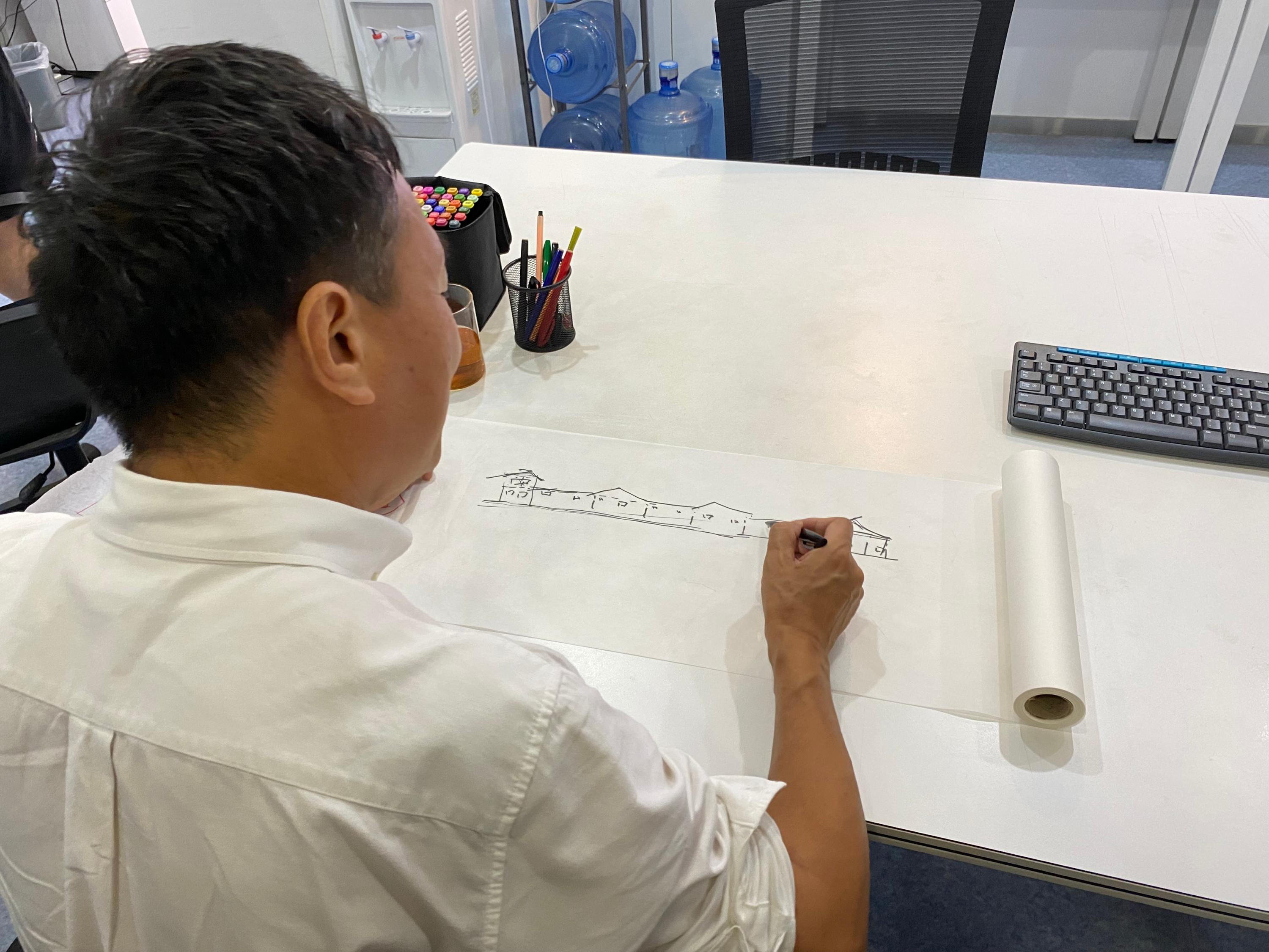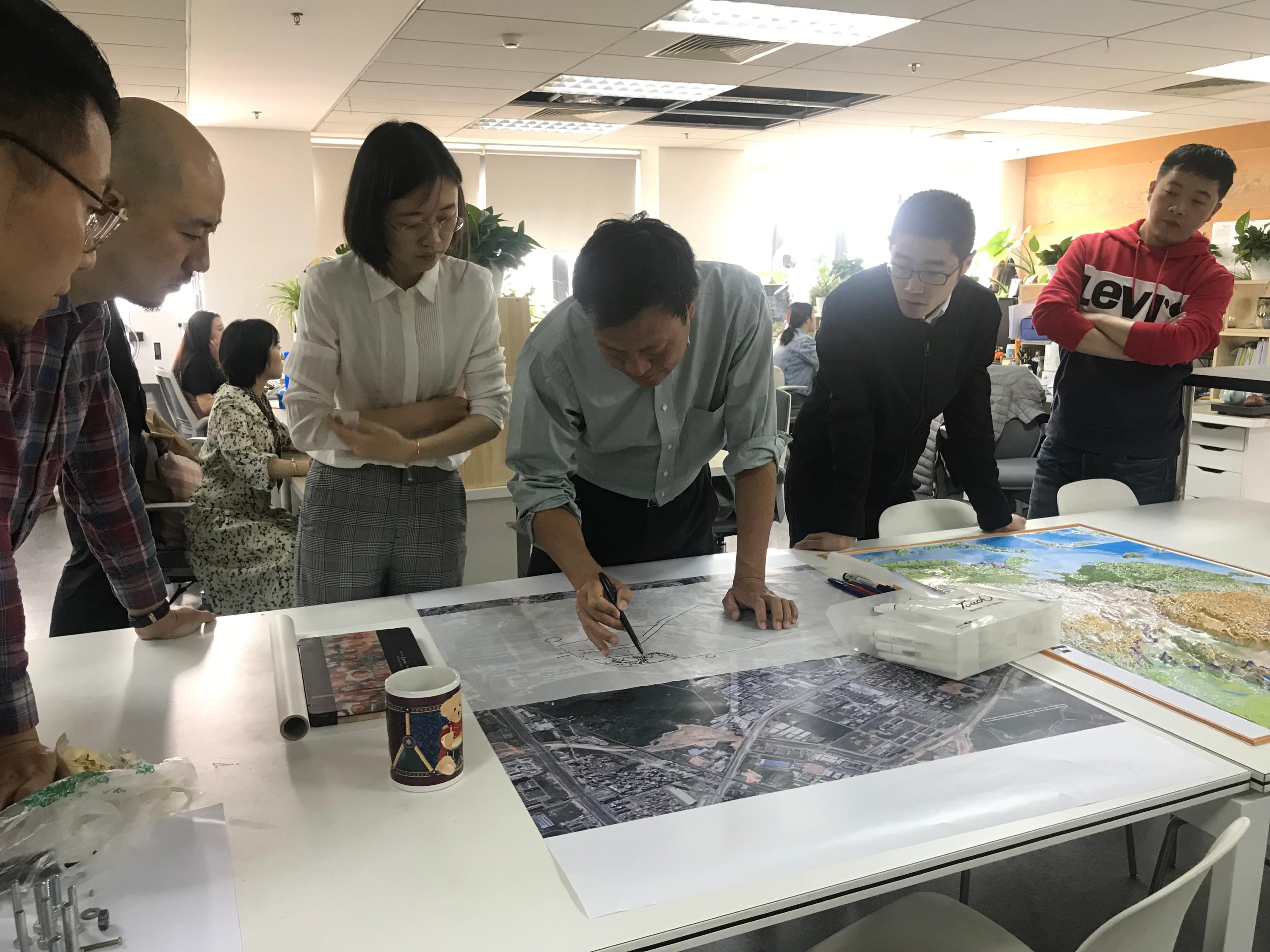 而博士对项目的判断力与出方案的速度,则更令人惊叹,通常项目开始前,我们会将项目的基础资料及我们认为的项目问题梳理成十五分钟左右的汇报,而博士在听完这些内容后,仅需一两分钟便能找到切入点,随后在大幅的硫酸纸上勾勒草图,边画边讲,一环扣一环:平面布局、空间模式图、整体结构框架、剖面、植物的品种……都一一随之流淌在纸上,一张看似潦草的草图,顺着他的思维逻辑,可以立刻在大家的脑海中勾勒出未来这片土地呈现的样貌,而这整个过程通常不会超过一个小时。而我自己,每次草图都会消耗掉好几天的时间,甚至很多时候草图画完,依然不知道最核心的切入点在哪里……