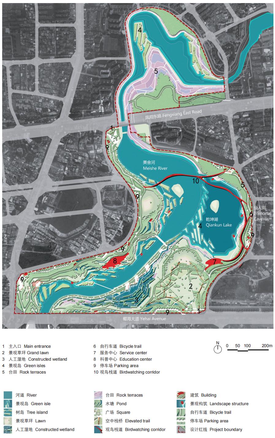 设计上,运用台田、密林、果园、湿地岛链等大地景观的手法展示凤翔公园自然之美