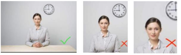 6.复试时,考生音频视频必须全程开启,并确保按下图所示的正确方式展现视频。露出桌面,桌面干净没有杂物。全程正面免冠朝向摄像头,保证头肩部及双手出现在视频画面正中间,保持注视摄像头,视线不得离开。不允许佩戴帽子、口罩、墨镜,头发不可遮挡耳朵,不得佩戴耳饰。